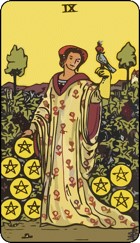 Lá bài Nine of Pentacles trong bộ bài Tarot Rider Waite mang đến hình ảnh đầy thong dong tự tại. Trên lá bài, chúng ta thấy một người phụ nữ đang thong thả đứng giữa khu vườn tươi tắn với cây cối xanh tươi, những chùm nho trĩu quả. Đây có thể là khu vườn sản nghiệp của bà, bởi ở người phụ nữ này toát ra một khí chất tự tin, kiêu sa như một quý bà thực sự.